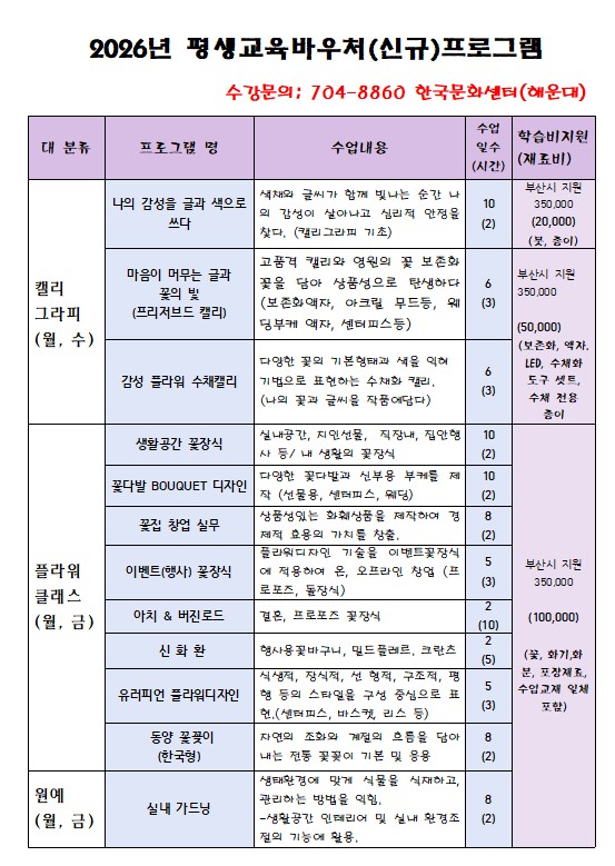 부산해운대 한국문화센터에서 2026년 평생교육바우처이용권 수업을 안내합니다.