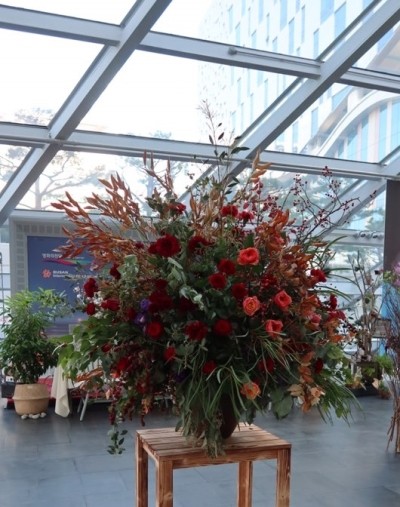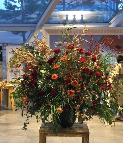 "꽃의기적" 부산플로리스트협회 주관 플라워디자인작가교류전을 축하하며 화환의 의미로 가을밀드플레르장식을 전시했습니다. 또한, 방문하신분들에게는 환영의 의미로 입구에 배치하고~~ 가장 뒷편에는 대형 갈런드를 걸어 전시 축하를~~전했습니다